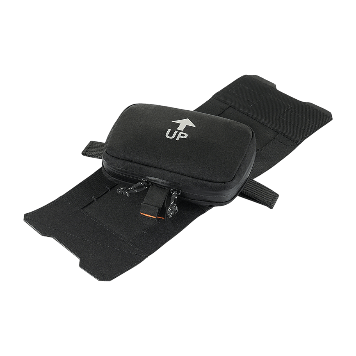 Järjestäjä on valmistettu Cordura 500D -kankaasta – kestävästä materiaalista, joka säilyttää muotonsa täydellisesti eikä muutu, vaikka se kastuisi. Vetoketju on YKK AquaGuard -vesitiivis malli, ja paracord-silmukka mahdollistaa laukun kiinnittämisen pohjaan. Laukku suljetaan kahden vetimen vetoketjulla ja se voidaan nopeasti irrottaa pohjasta molemmilta puolilta. Etuosassa oleva termosiirretty merkki näyttää selvästi ensiapupakkauksen sijainnin.