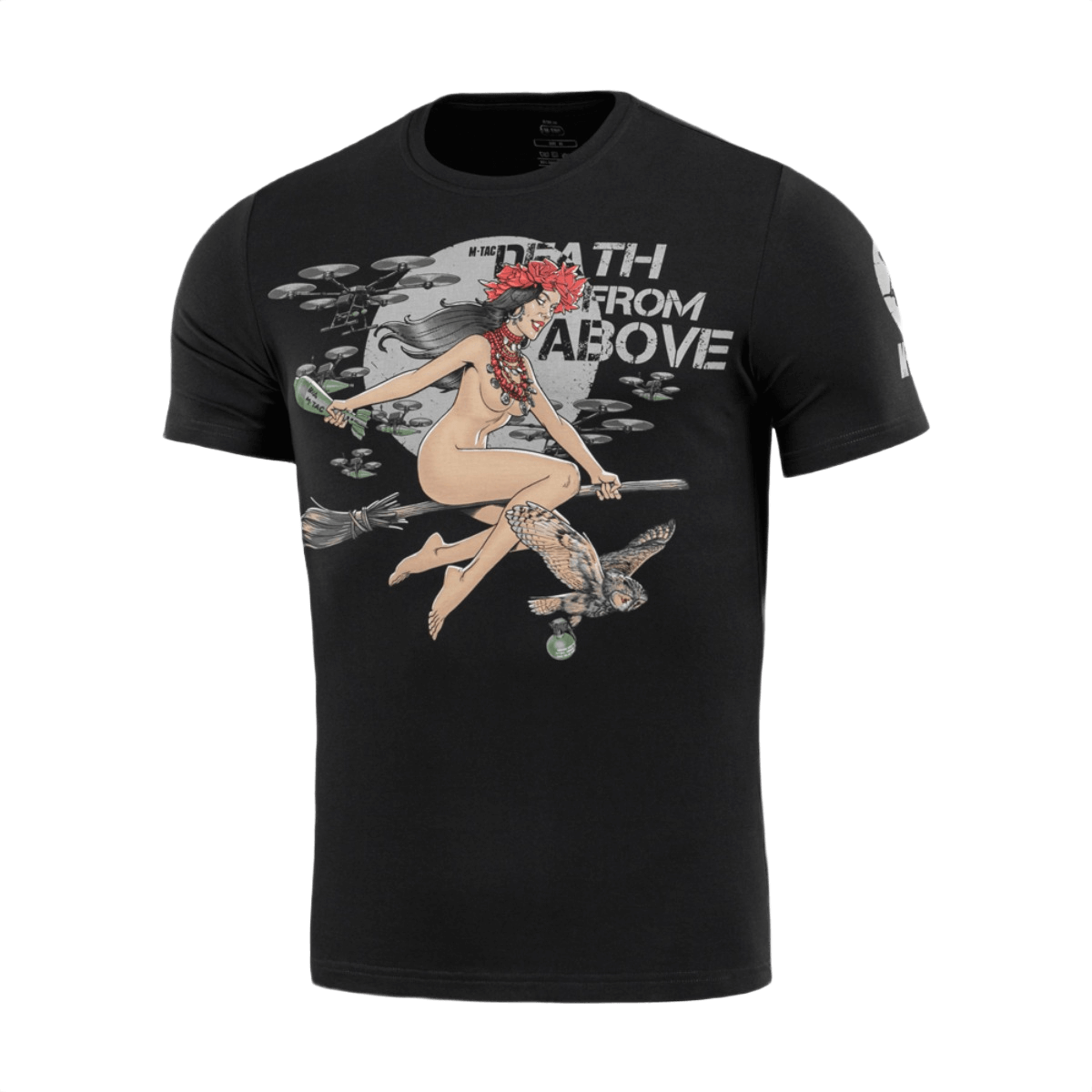 M-Tac T-Shirt Death From Above kombinerer ukrainsk folklore med moderne militært tema. Printet viser en frygtløs heksefigur med støtte fra dødelige droner og en vis ugle.