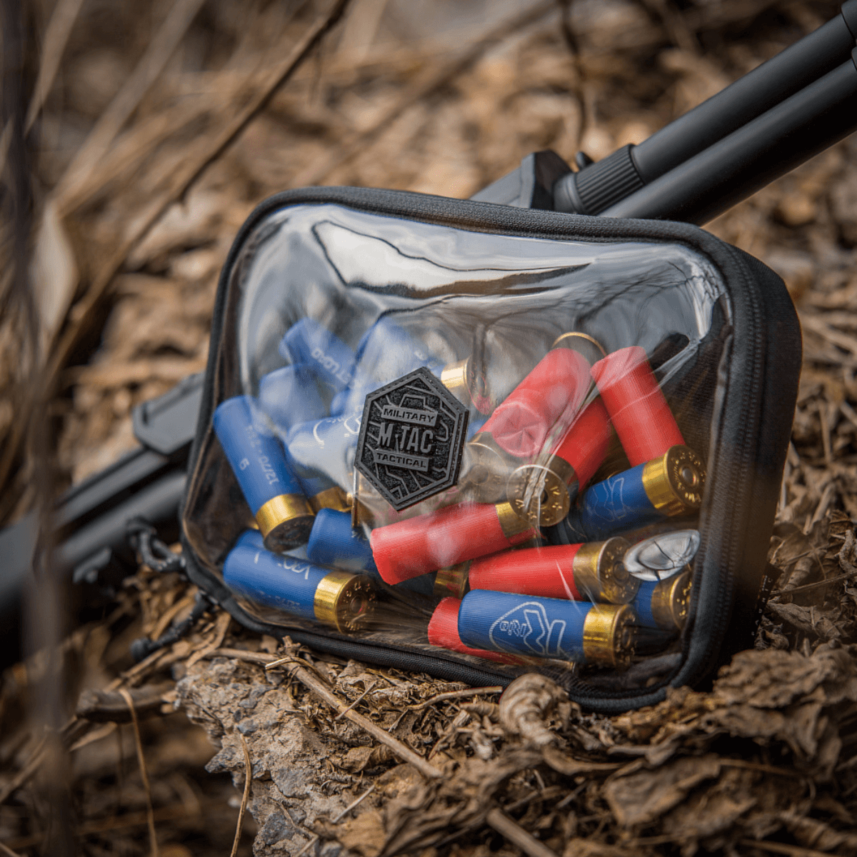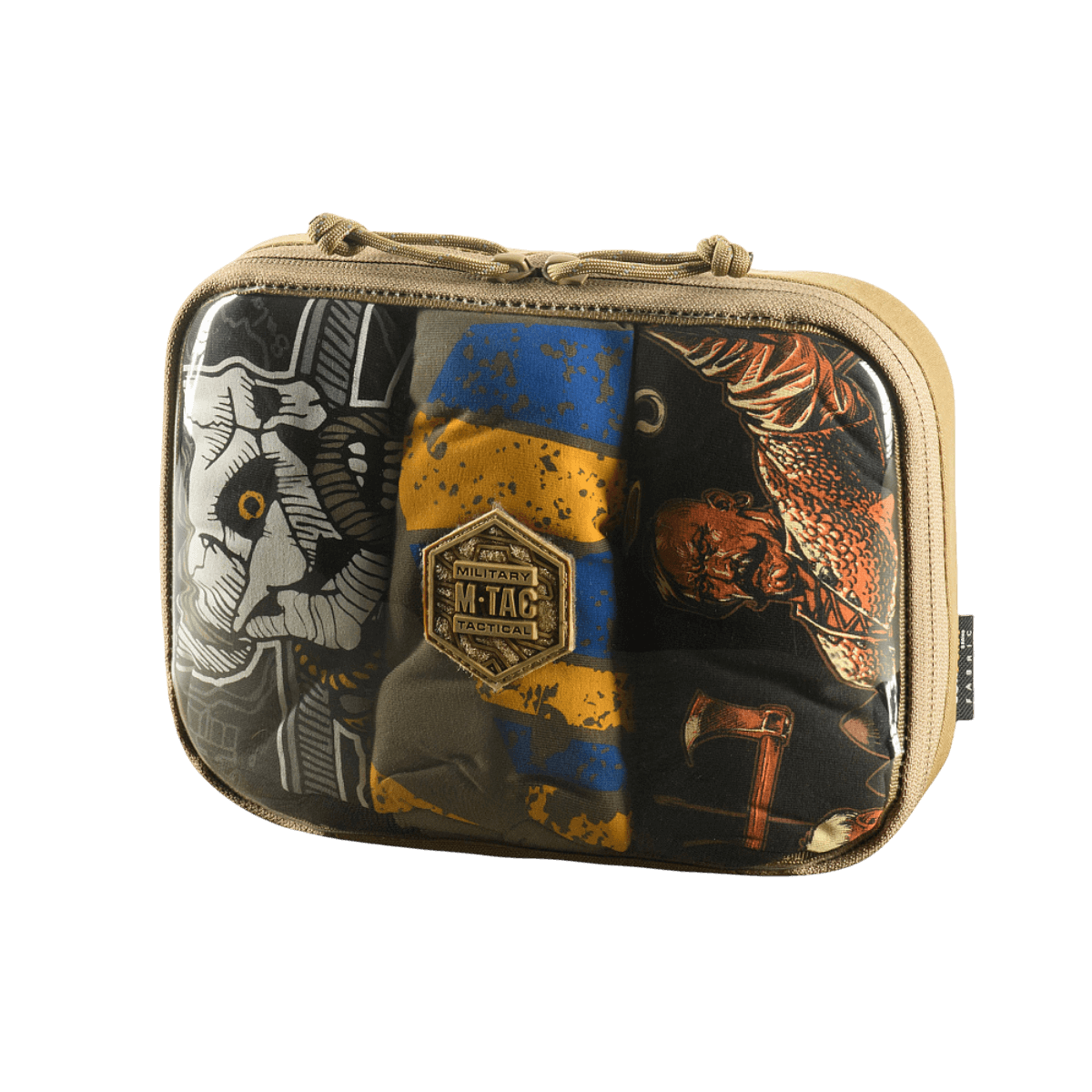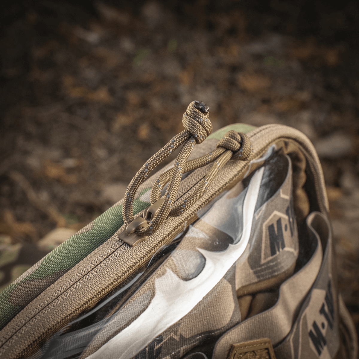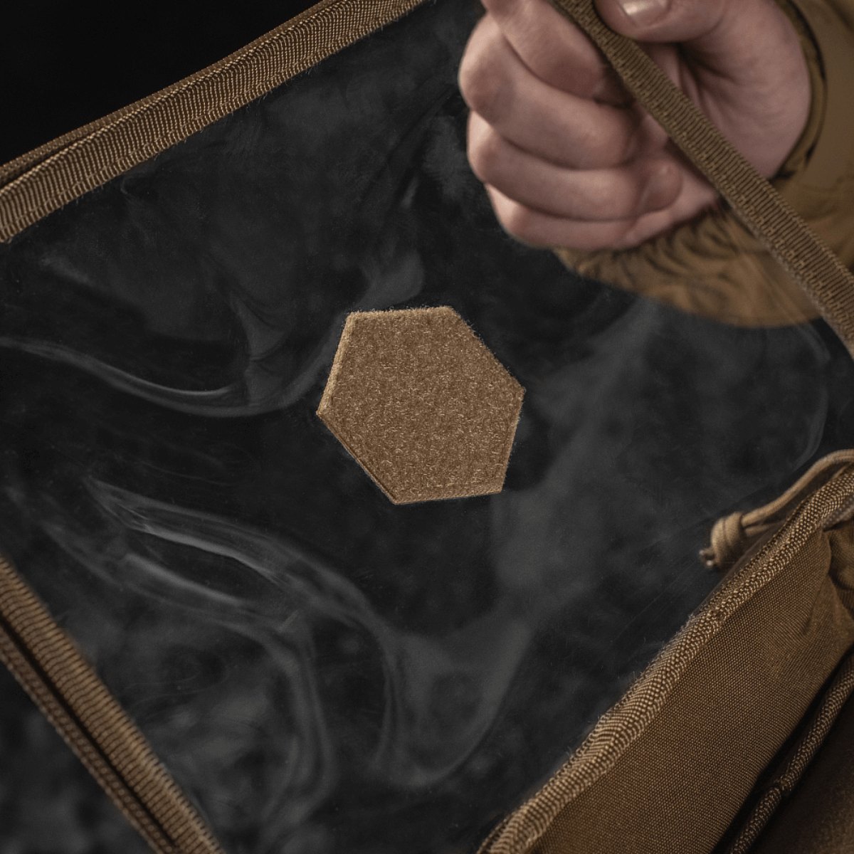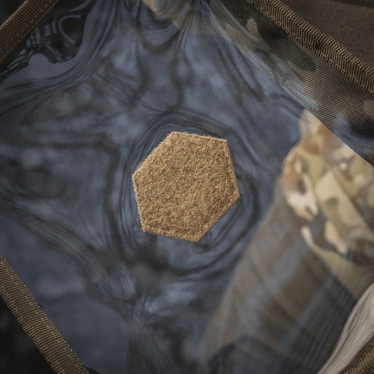 - Kirjailtu kuusikulmio M-Tac-logolla keskellä.